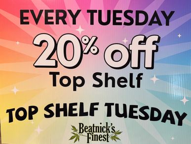 get 20% off top shelf flower every Tuesday